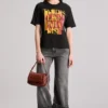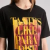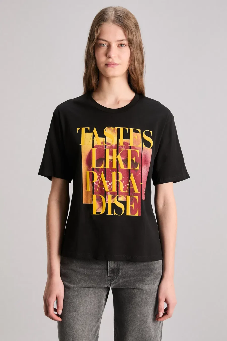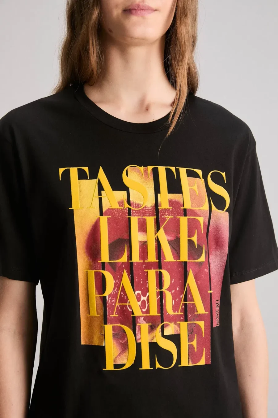 La remera Like Paradise tiene calce regular con cuello redondo y mangas cortas. Confeccionada en jersey de algodón. Posee estampa única en frente de la prenda con detalles en técnica flock.