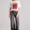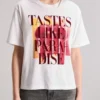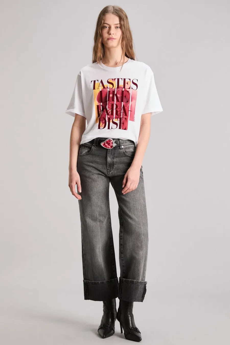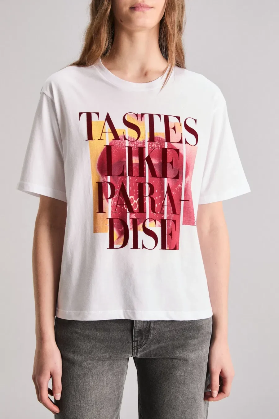 La remera Like Paradise tiene calce regular con cuello redondo y mangas cortas. Confeccionada en jersey de algodón. Posee estampa única en frente de la prenda con detalles en técnica flock.