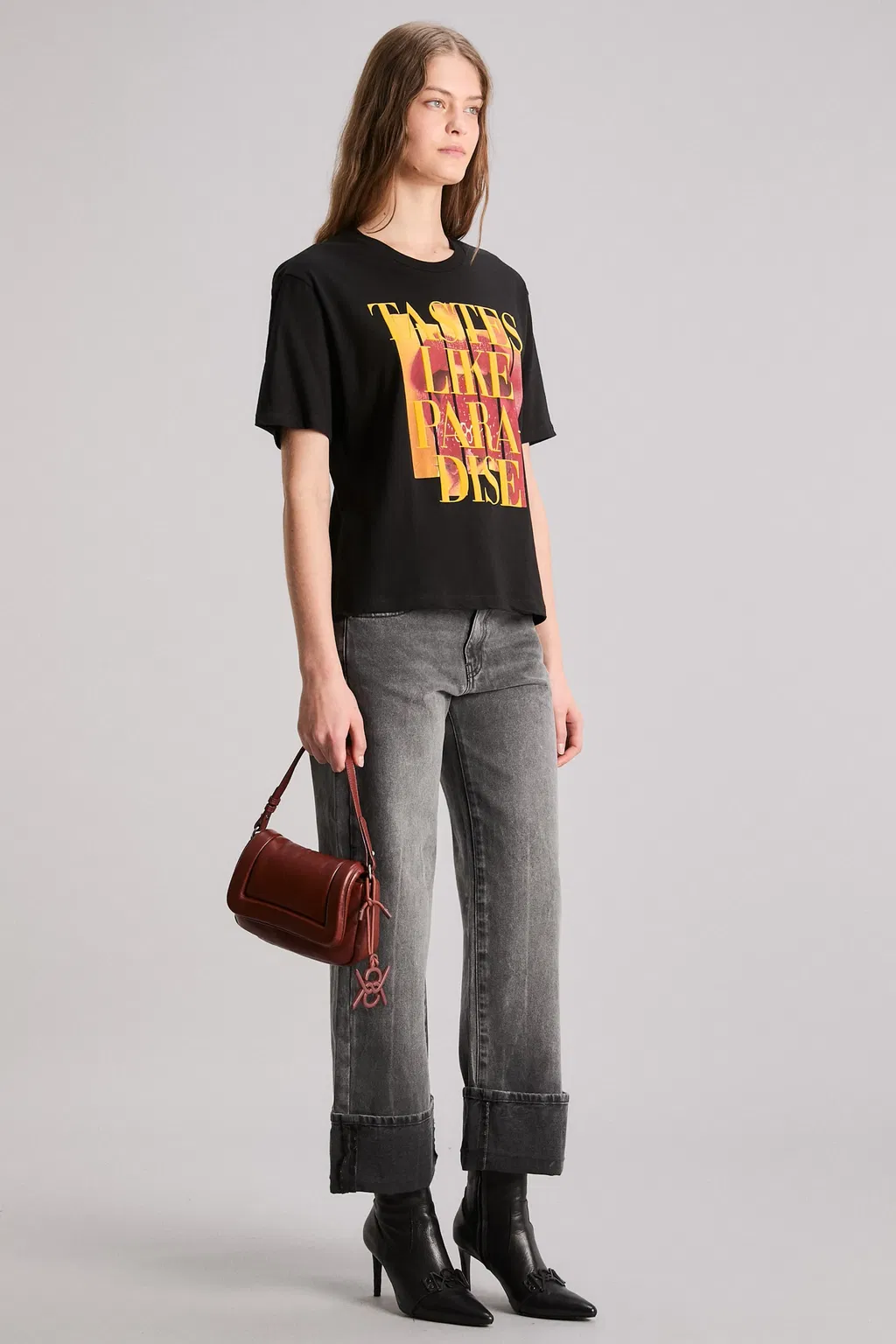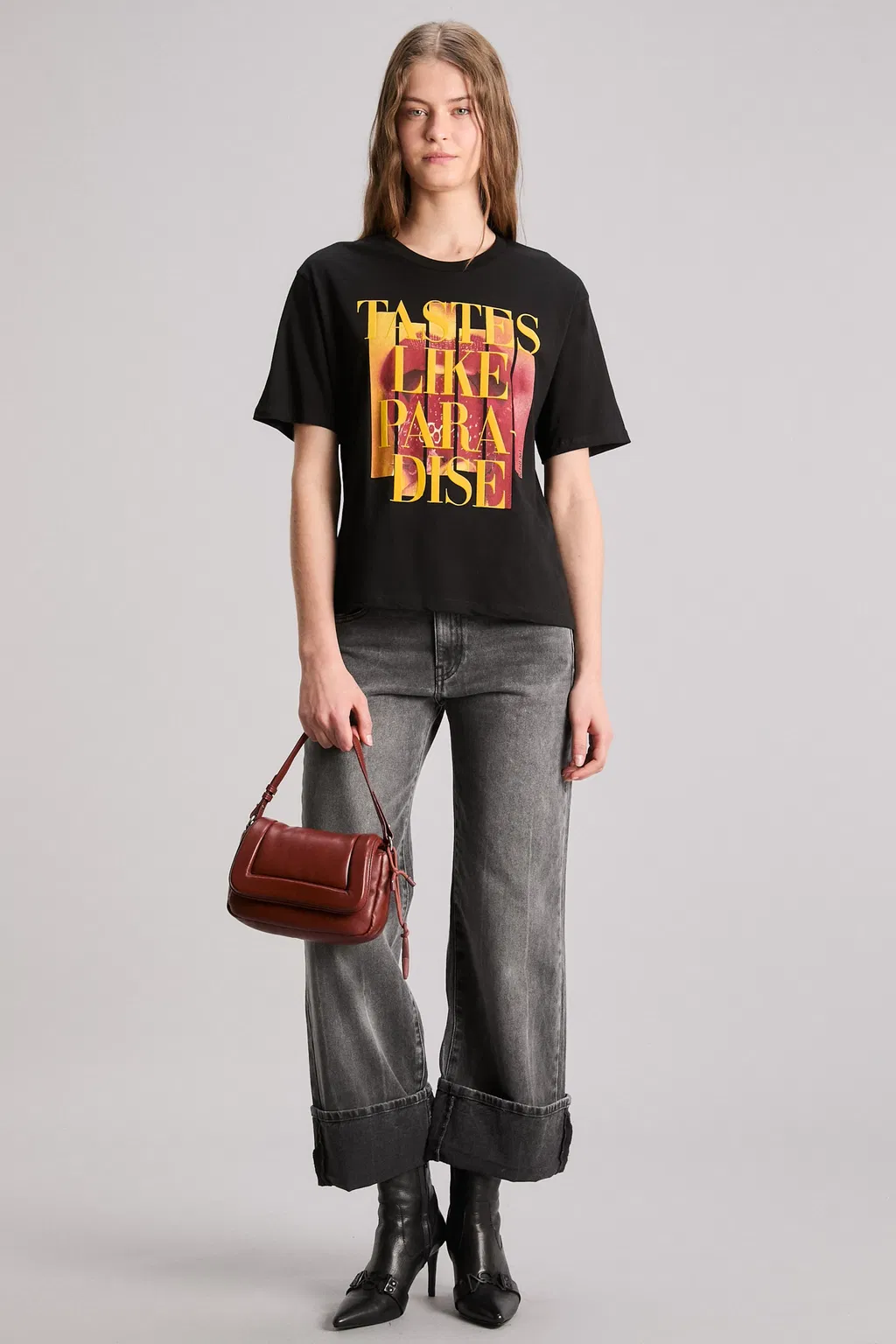La remera Like Paradise tiene calce regular con cuello redondo y mangas cortas. Confeccionada en jersey de algodón. Posee estampa única en frente de la prenda con detalles en técnica flock.
