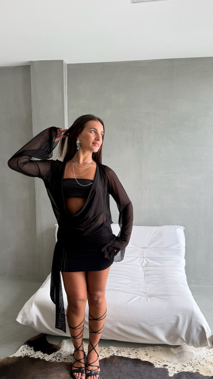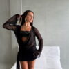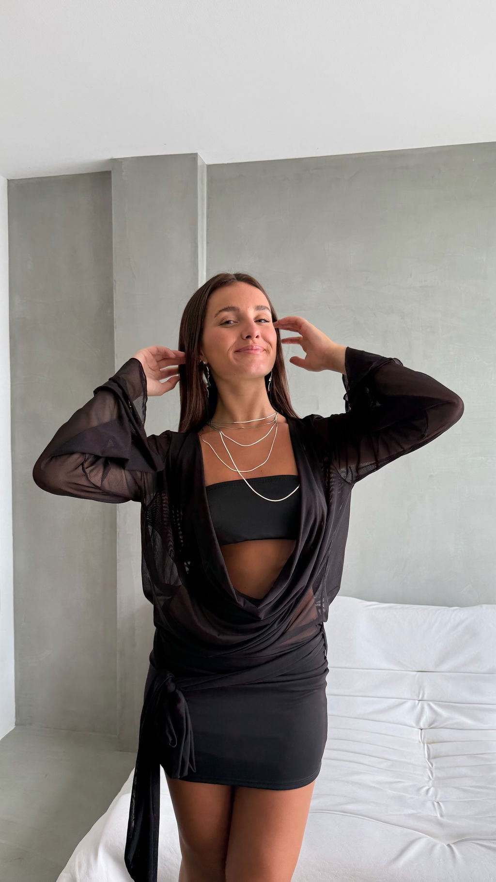 Vestido manga larga de tul con detalles de cinturón y falda forrada.